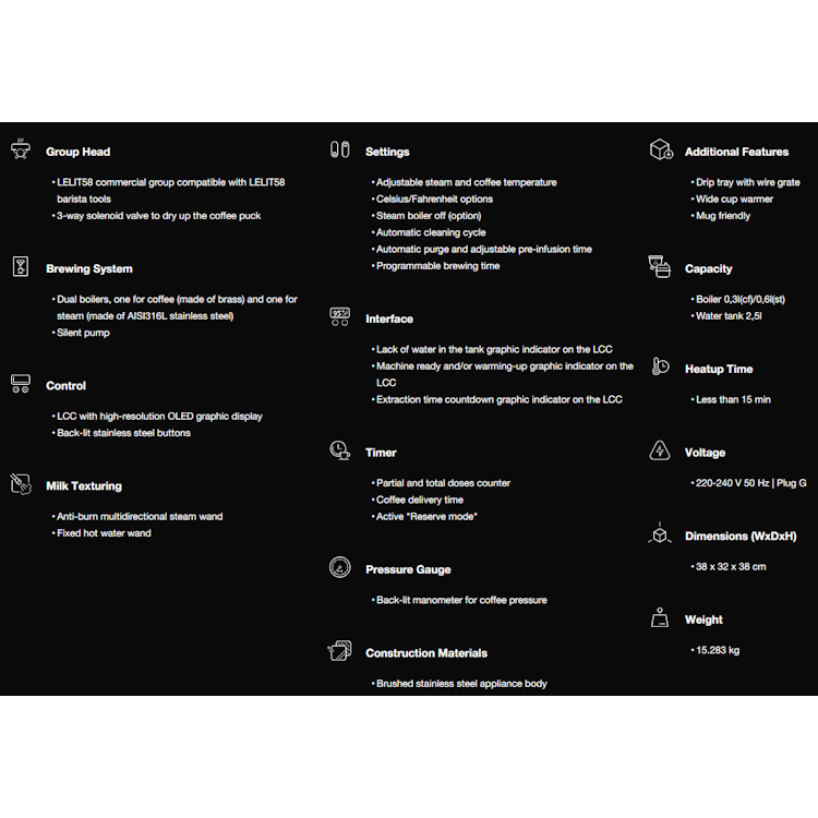 The dual boiler and the LELIT58 commercial group are Elizabeth’s special features and ensure a continuous steam delivery and the extraction of considerable quantity of water, without influencing coffee performance. The accurate choice of materials and its details make it a wonderful piece of design even when the machine is turned off.