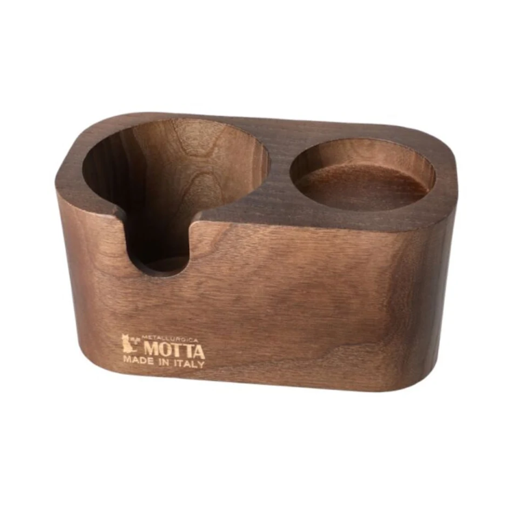 This wooden tamping set with 2 positions. The portafilter is held securely in the left hand position whilst the tamper is removed from the right hand slot for tamping.